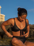 The Black Point Tie Front Bikini Top is super easy to put on, which is key to changing under a towel or with your clothes on. You'll have support and coverage with a low neckline and a cute front tie making it completely adjustable. This style is also hardware free and sewn from shiny black recycled fabric that is better for our oceans. Easily mix and match with prints or solid colors.
