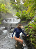 If you're in need of extra protection while out in the ocean, look no further than the Manta Long-Sleeve Surf Suit. This one piece swimsuit features a crew cut neckline and full coverage in the front so it can be used like a rashguard for surfing or freediving. You'll never have to worry about man o' war stings or see through fabric since the entire body is double lined. In addition to being made from recycled materials, this monokini offers sun protection and has a custom cutout back with cross strap details and an adjustable neck tie for the perfect fit.