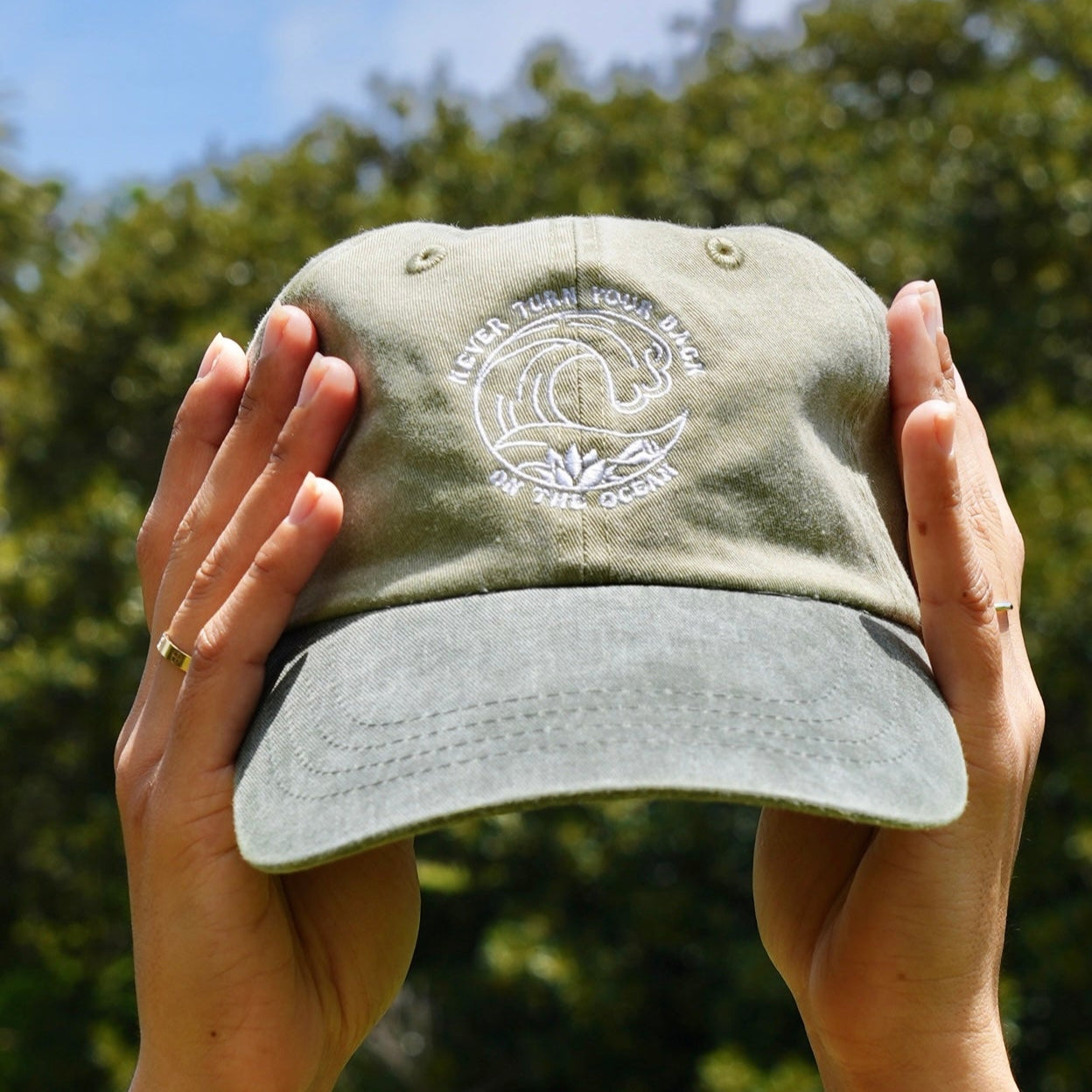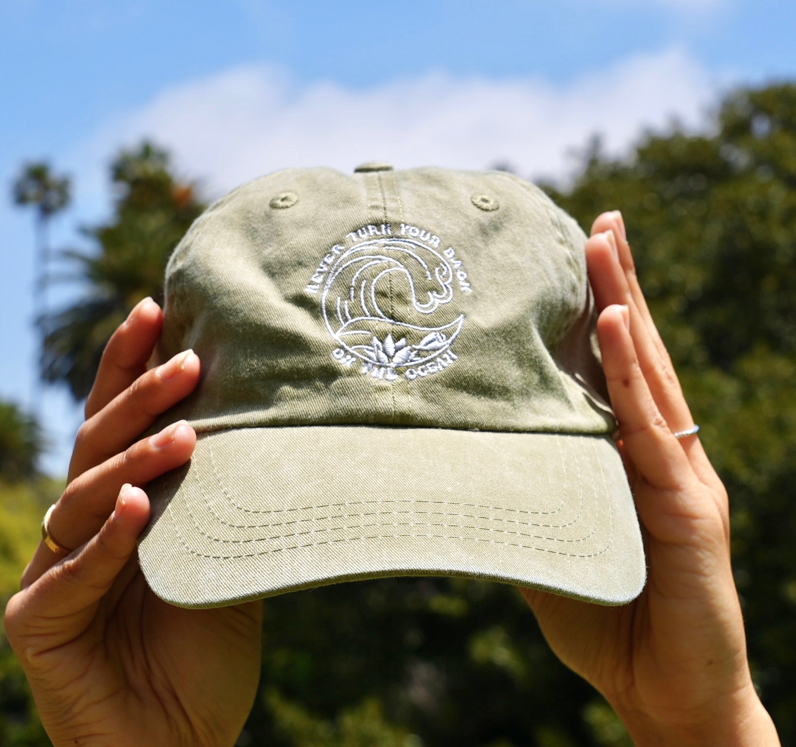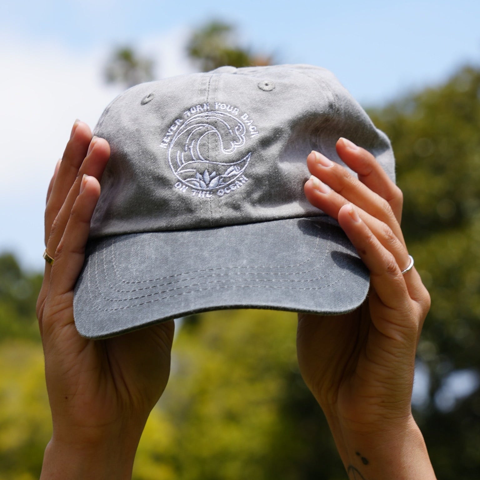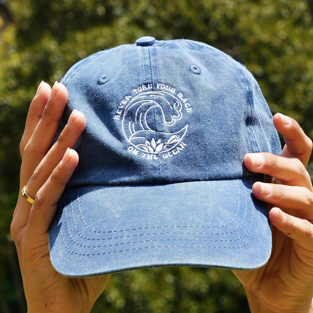 Our ultra popular embroidery design on a hat! This unstructured, low profile dad hat has a lived in look to match your laid back lifestyle and comes in five colors. The Kaiona Swimwear exclusive "never turn your back on the ocean" design is hand drawn and embroidered in white thread. This saying, which all local kids are taught growing up in Hawai'i, is a lesson in ocean safety, but also used to instill respect for the ocean from an early age.