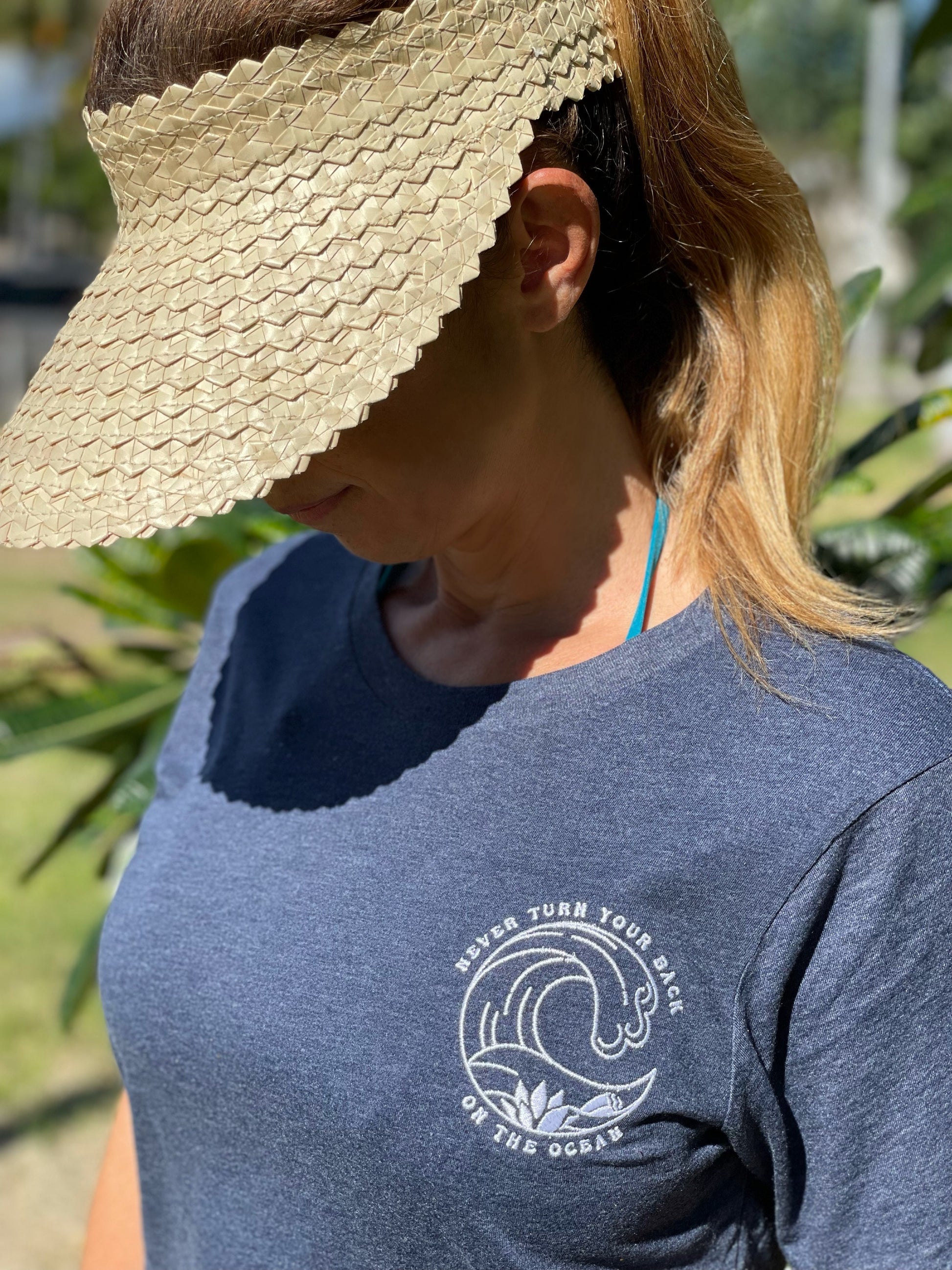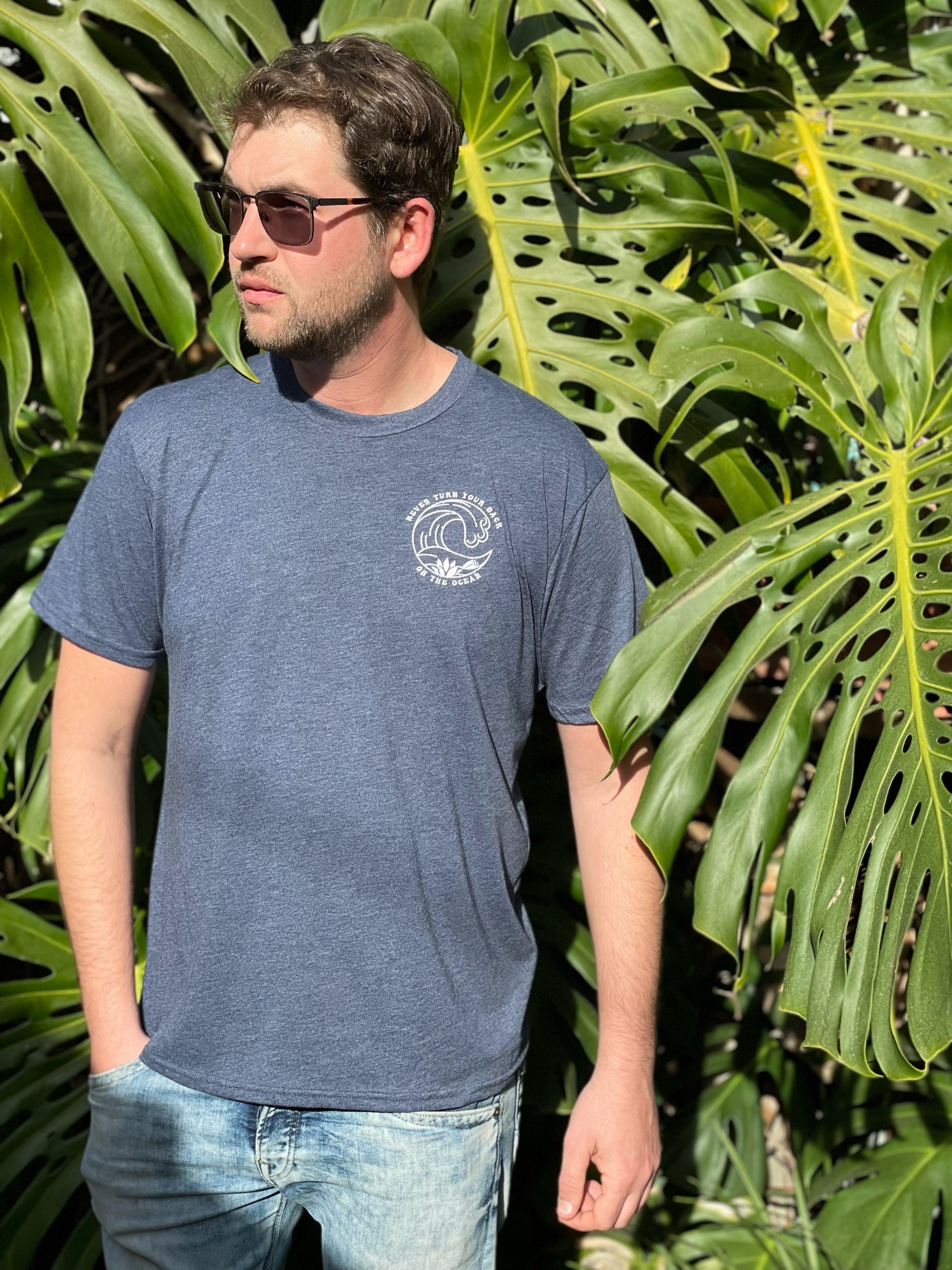 This hand drawn design is inspired by a saying all local kids are taught growing up in Hawaiʻi, "Never turn your back on the ocean." Partially to teach a lesson in safety, this saying is also used by parents as a way to instill respect for the ocean, which can suddenly decide to hit you from behind on the shore, even on a calm day. The exclusive embroidered design is made with navy thread on the white tee and white thread on the blue and green t-shirts. Each eco-friendly tee is ethically made in the USA from organic cotton and recycled polyester using a special technique that results in zero water waste!