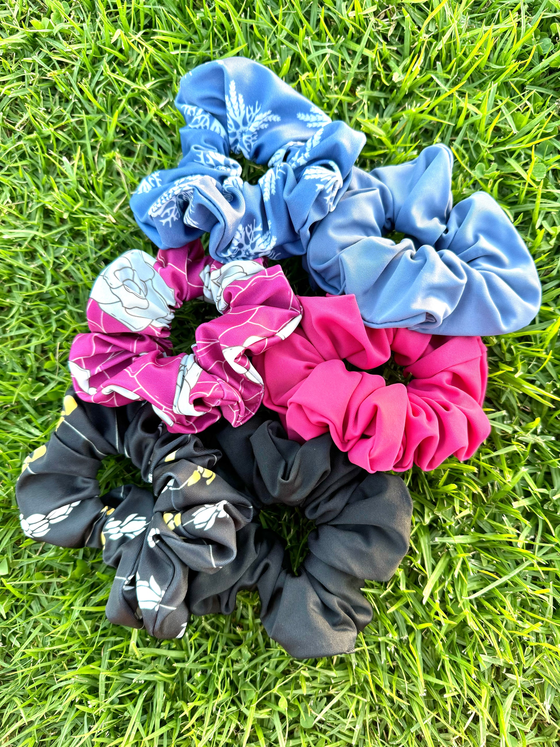 Complete your beach style with a scrunchie that matches your swimsuit! Made from recycled swimwear fabric, these scrunchies are designed to keep your hair out of your face while you swim, surf, or kayak.