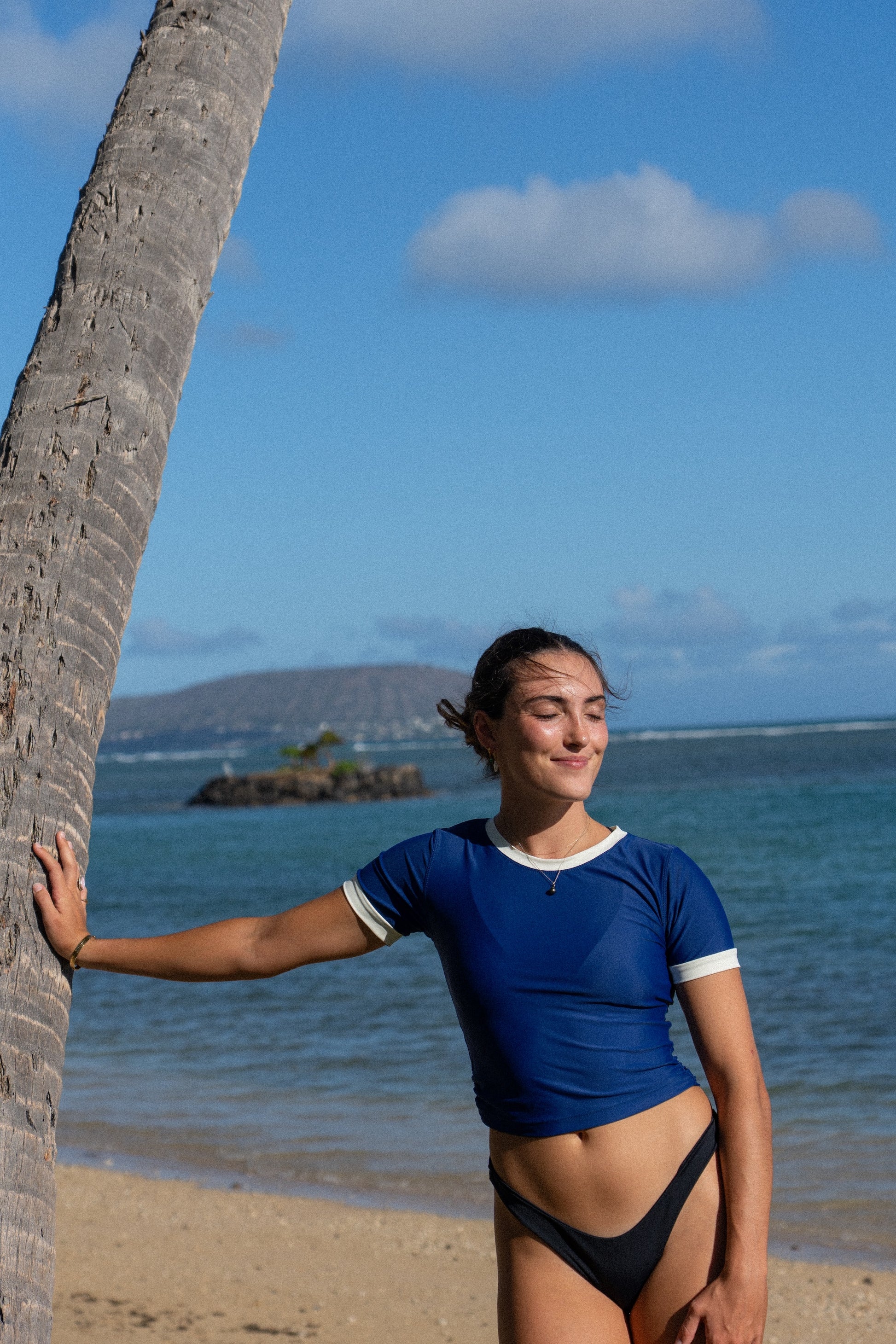 Add our cropped Short Sleeve Rashguard Top to your beach rotation. This rashie is designed for active women who want performance, protection, and versatility all in one top. Made from premium recycled swim fabric with UPF 50+ sun protection, this rashguard keeps your skin safe during long days under the sun while delivering a flattering, modern fit with full range of motion.