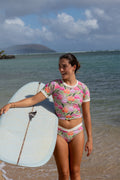A water-friendly zipper stash pocket in the back, gives you secure storage for keys or small items while you surf or paddle. Chlorine resistant and quick-drying, this versatile top isn’t just for the ocean. It also doubles as the perfect workout top, hike-ready layer, or even a cute crop tee with jeans. Available in matching hand drawn prints that coordinate with our bikini sets.